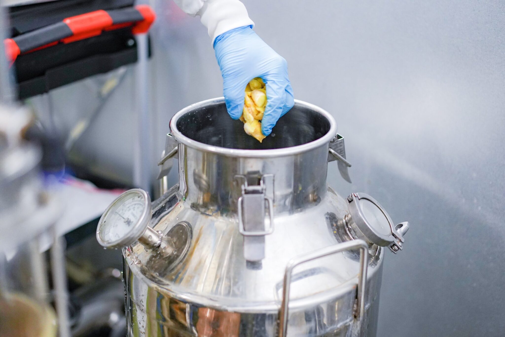 機械を元に戻す前から春ウコンの香りがしていたのですが蒸留機の口が開かれると湯気と共にかなりの春ウコンの香りが込み上げてきました。