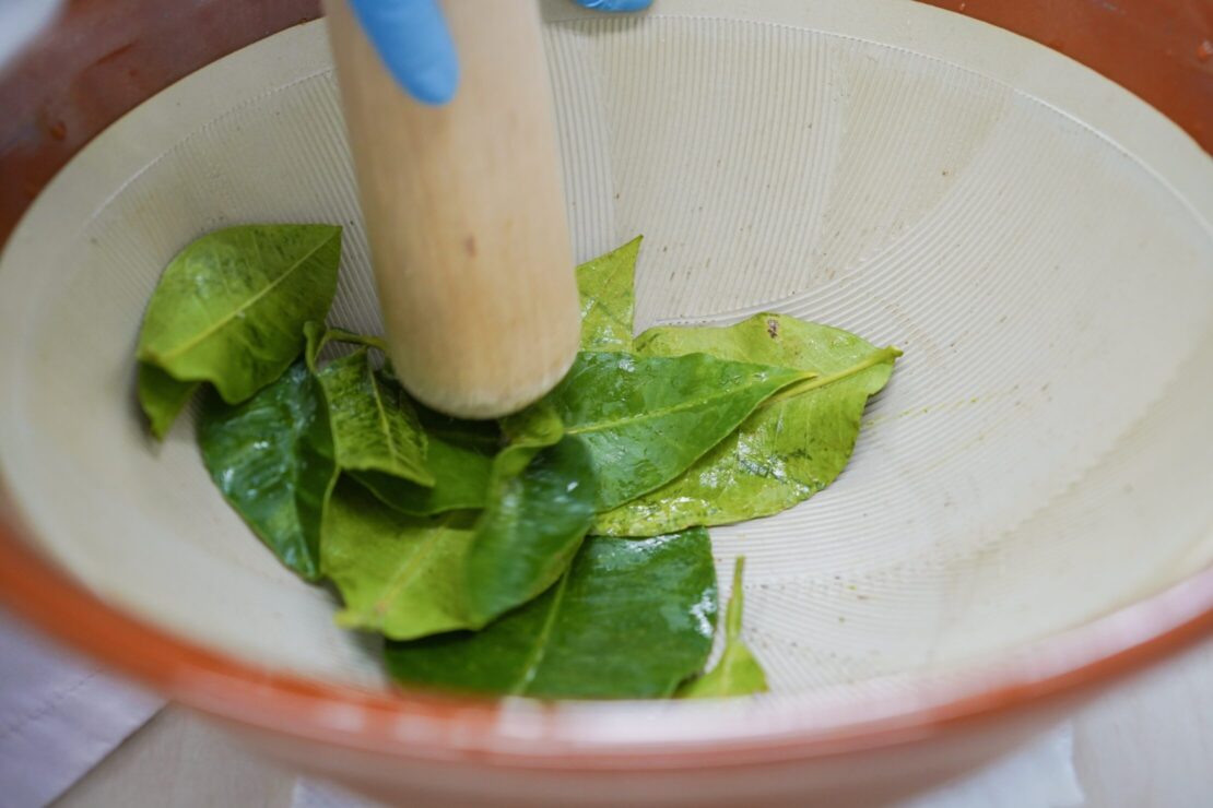そこで今回のジンにはすり鉢で軽くすりつぶし、香りを立たせたベルガモットリーフを使いました。