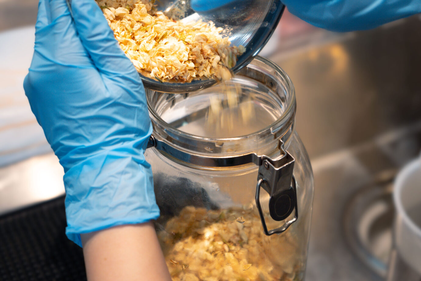 低めのアルコール度数で蒸留した桃からは、まずフレッシュな桃の香りが立ち上がってきました。蒸留を進めると、次第にバターのような乳感のある香りが立ち上がり、そのタイミングを慎重に見極めカットを行いました。ジュニパーベリーのパーツと合わせてみると、桃の濃厚で甘い香りがしっかりと引き立ちました。ただ、それだけでは味に締まりがなく、お酒というよりもジュースのような印象に。そこで、後味を締める要素として何度も試行錯誤を重ね、桃の香りを邪魔せず、より一層引き立たてる理想的な素材として、ジャスミンの花にたどり着きました。甘く柔らかな味わいの中にある、ほんのわずかな花の渋みが全体を整えてくれています。
