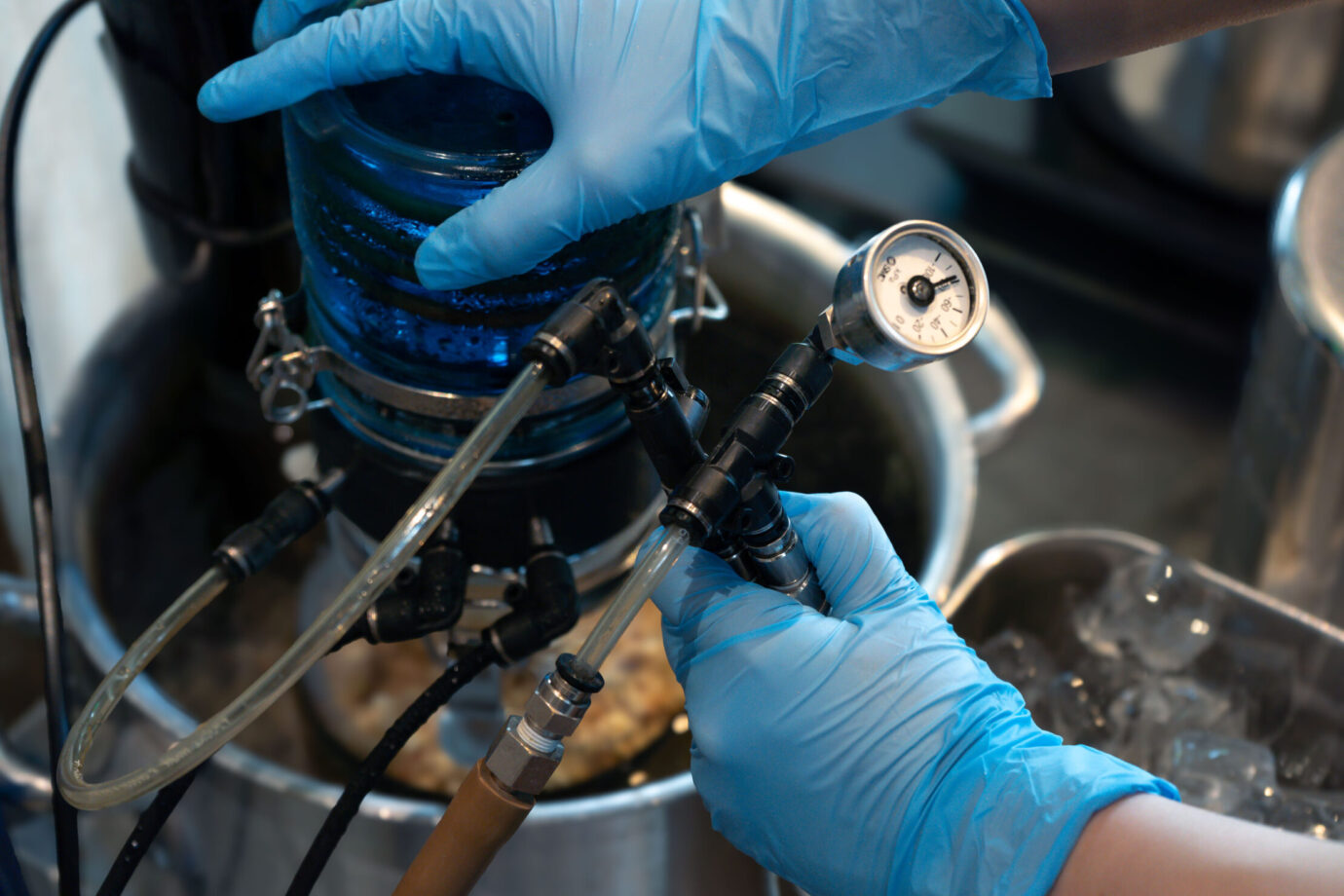 使用したのは、長野県産と新潟県三条市産の桃。届いたその日から一つずつ香りを確かめ、完熟を見極めてから使用しています。今回のボタニカルは、ジュニパーベリー、桃、ジャスミンの花の3種のみ。ジュニパーベリーと桃は、個別に常圧蒸留し、ジャスミンは減圧蒸留で、素材ごとの良さを引き出しました。しかし、この3種だけの設計でも納得のいくバランスに仕上げるまでには、試作と検証を幾度も重ねる必要がありました。
