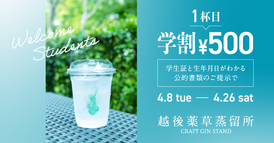 Echigo Yakuso Craft Gin Stand (Omotesando) will hold a campaign from April 8 (Tue.) to April 26 (Sat.), 2025, offering the first drink of an eligible drink for 500 yen (tax included) for those who present a student ID card.